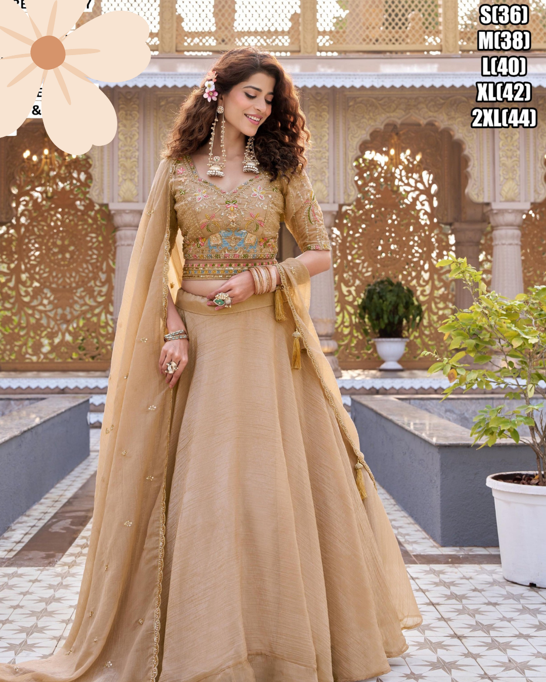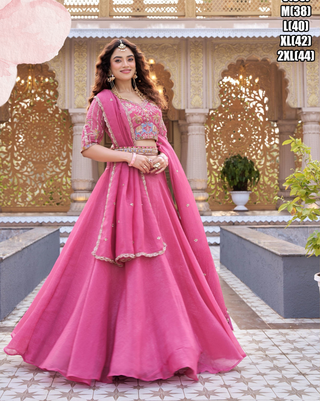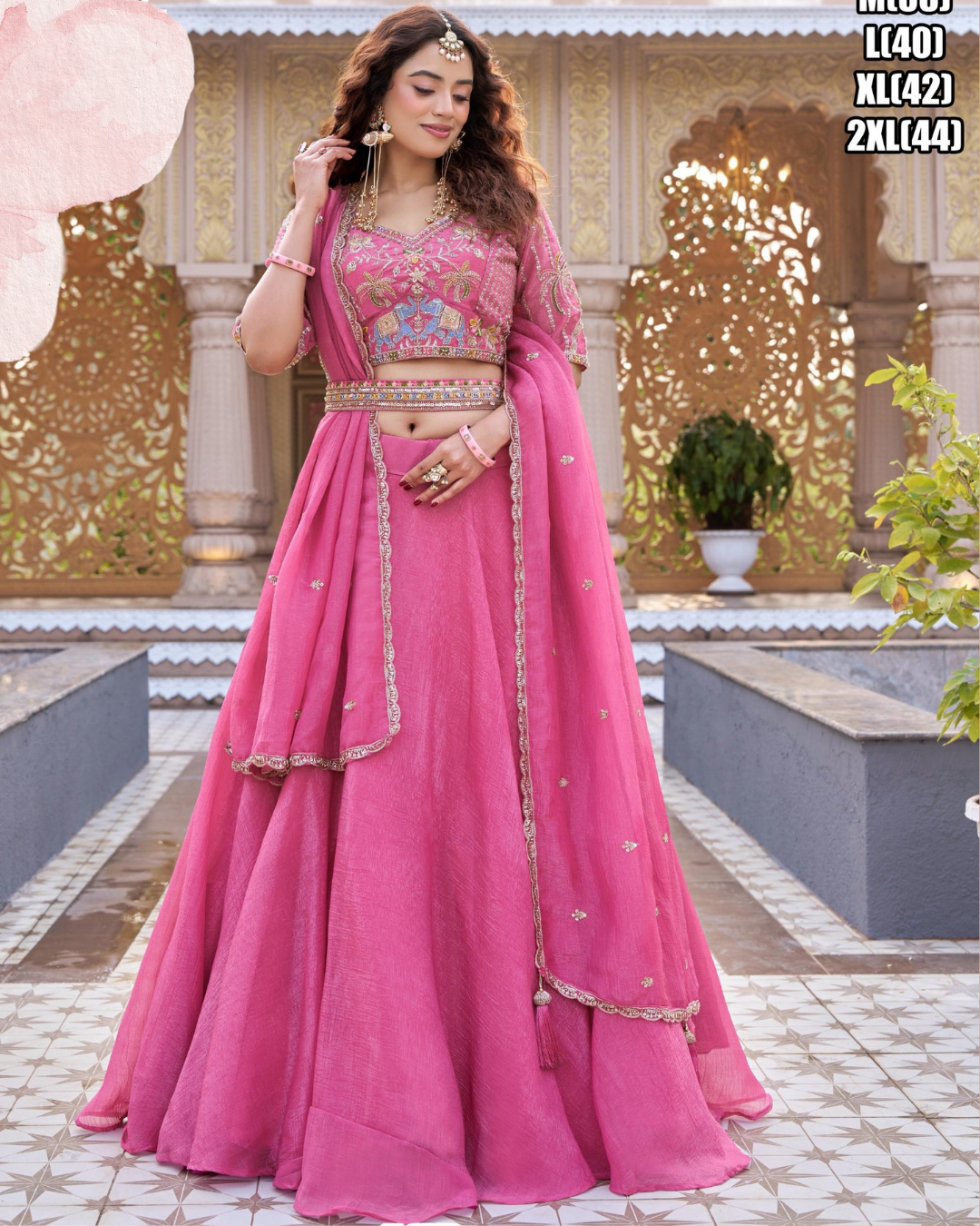 This luxurious 3 pc suit is designed as a premium Pure Crunchy lehenga set, featuring a lehenga with micro-cotton inner and a grand 9-meter flair, paired with a matching blouse and dupatta, all enhanced with rich moti, sequence, and thread embroidery. Ideal for weddings and festive occasions, this ensemble delivers royal volume and timeless elegance.