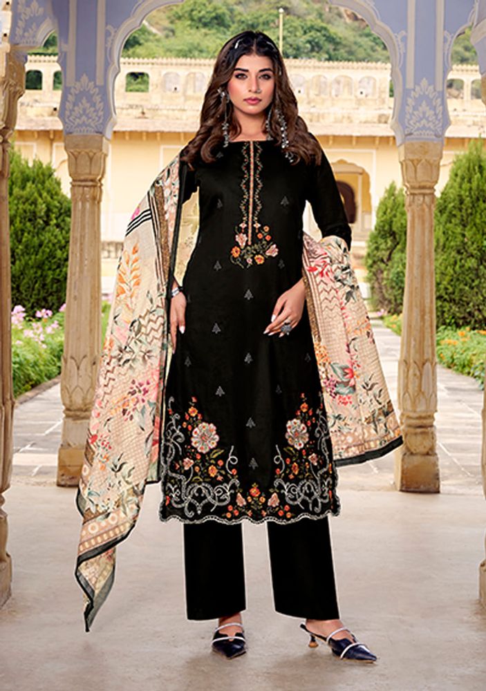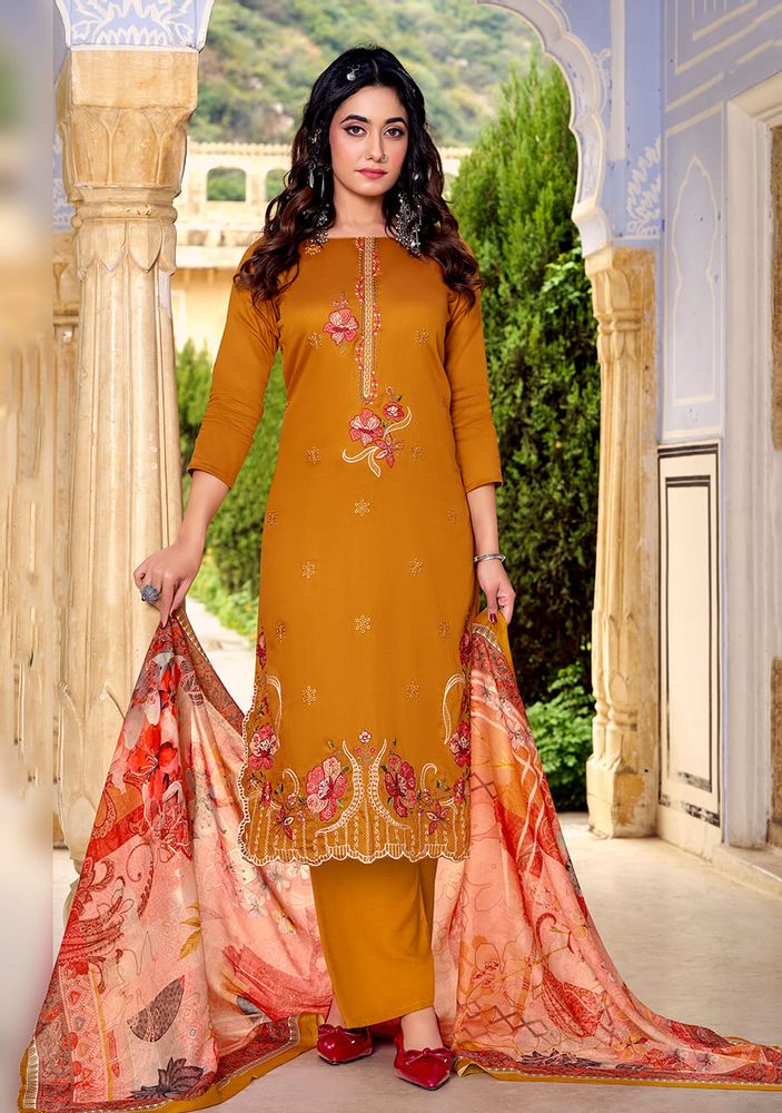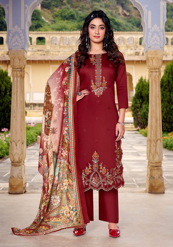 This elegant 3 pc suit is crafted with a pure heavy Jam embroidered top featuring daman boring and scalloped detailing, paired with a pure cotton mal mal box digital print dupatta and a comfortable pure viscose rayon bottom.