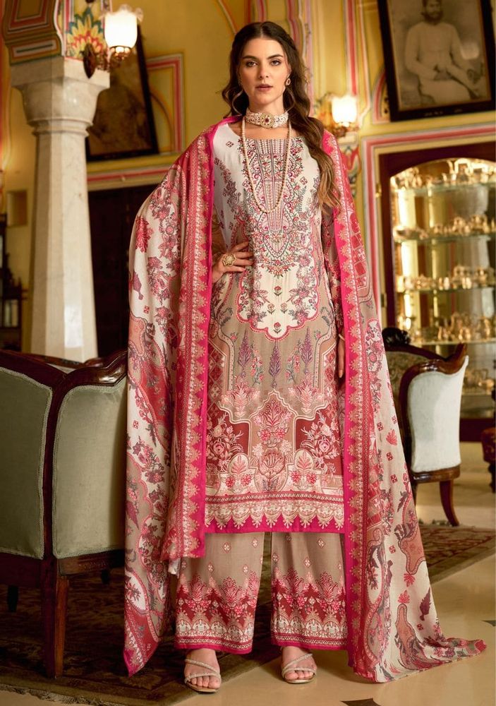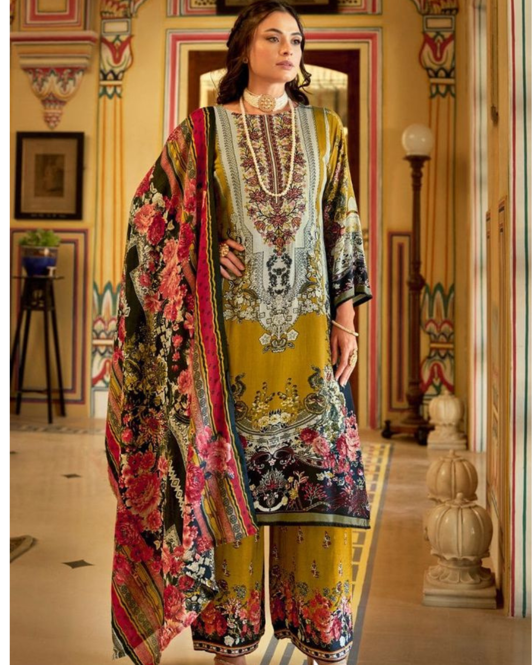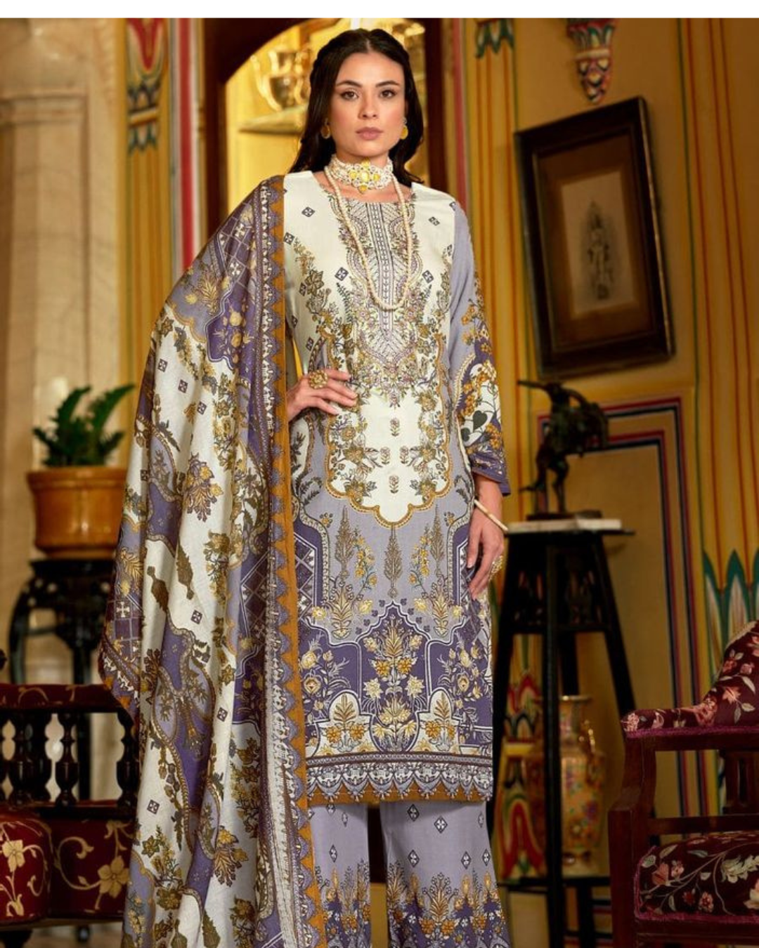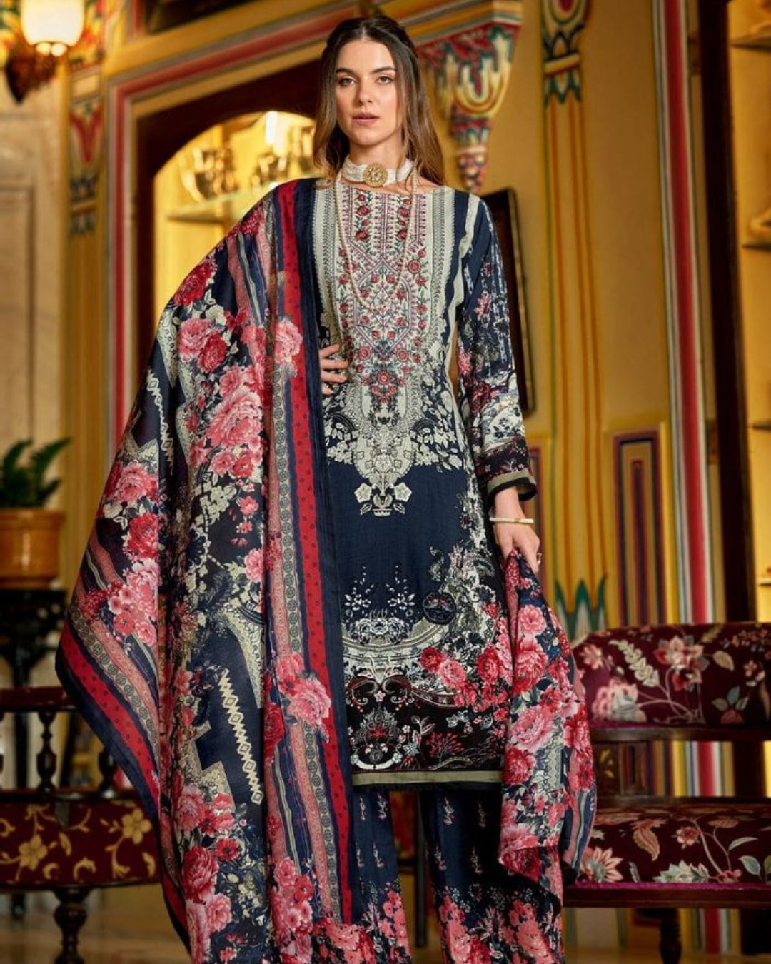 This elegant 3 pc suit is crafted in premium soft cotton, featuring a digitally styled printed top with heavy self embroidery, paired with a soft cotton mal mal dupatta and a comfortable soft cotton salwar.
