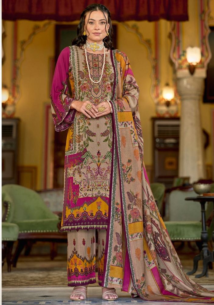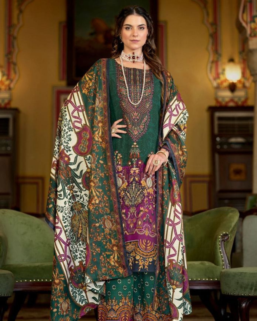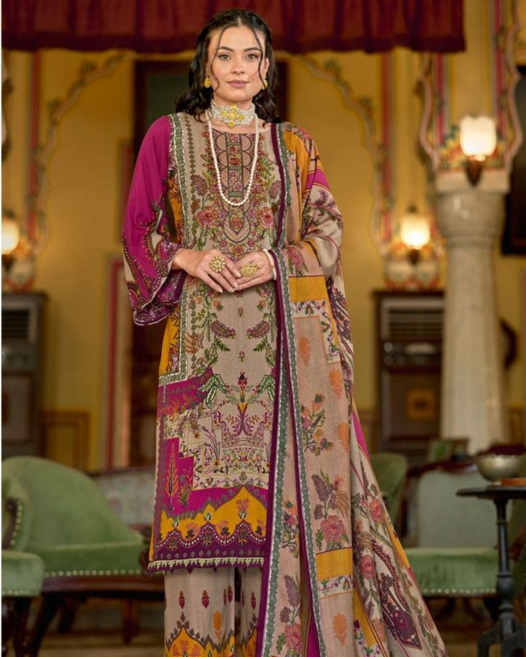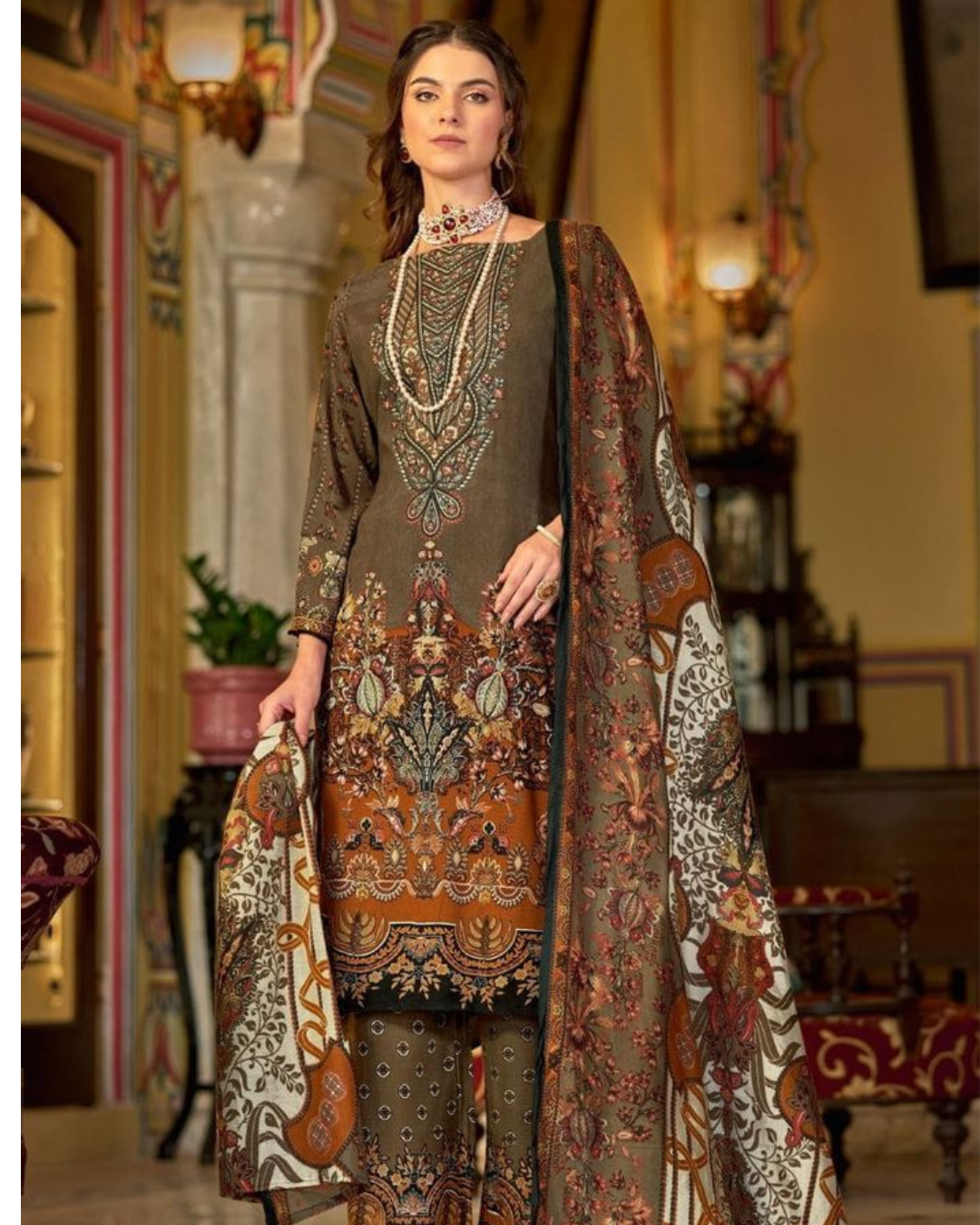 This elegant 3 pc suit is crafted in premium soft cotton, featuring a digitally styled printed top with heavy self embroidery, paired with a soft cotton mal mal dupatta and a comfortable soft cotton salwar.