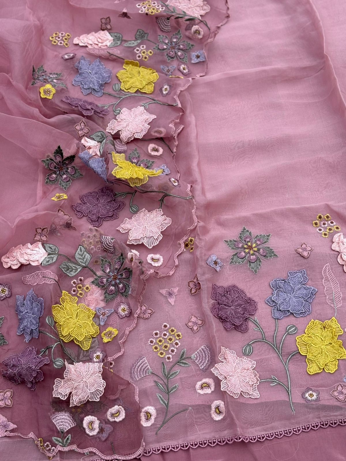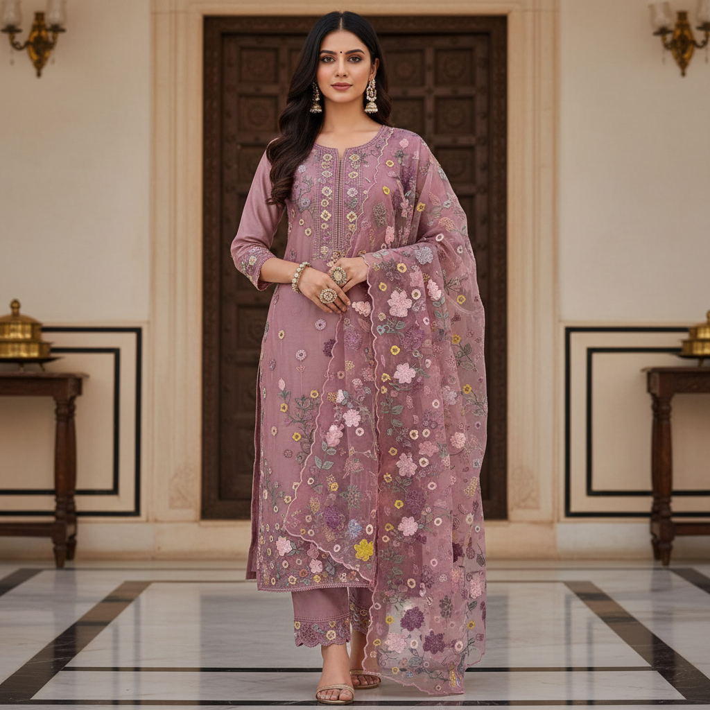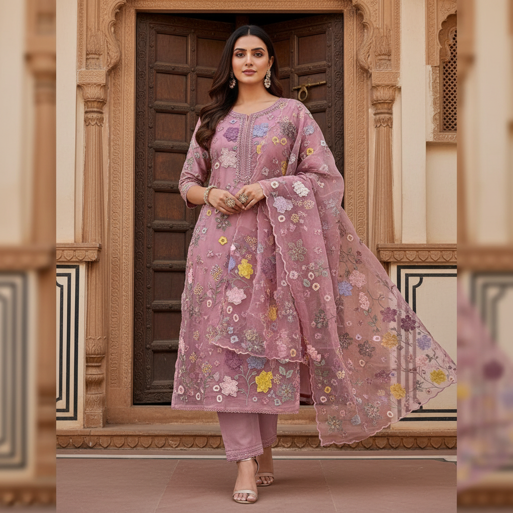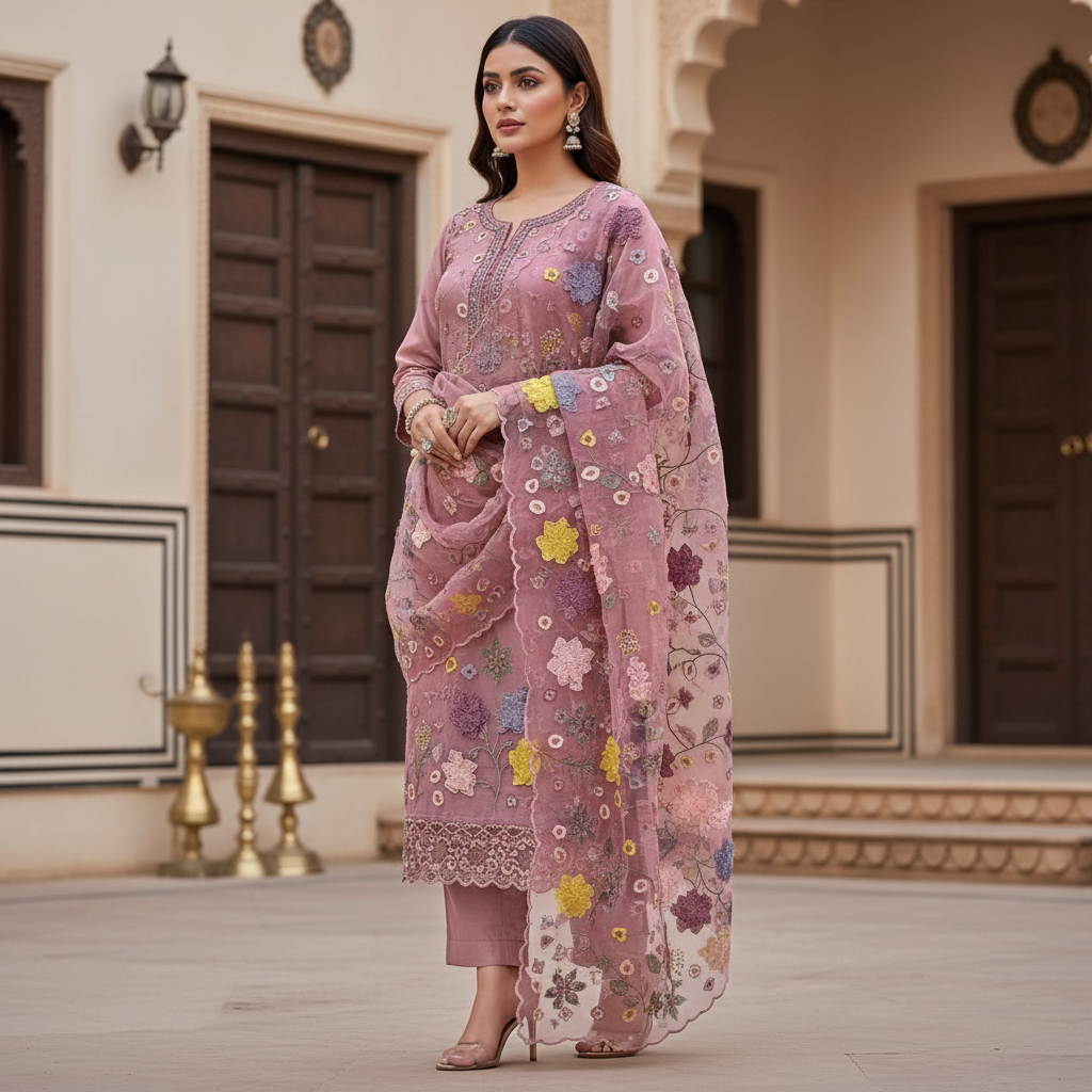 3 pc suit Pure Organza kurta (35 grams) featuring elegant Parsi embroidery with applique cutwork, paired with a Pure Organza ombré-dyed dupatta in applique work and a pure crepe silk bottom. A refined ensemble for festive and special occasions.