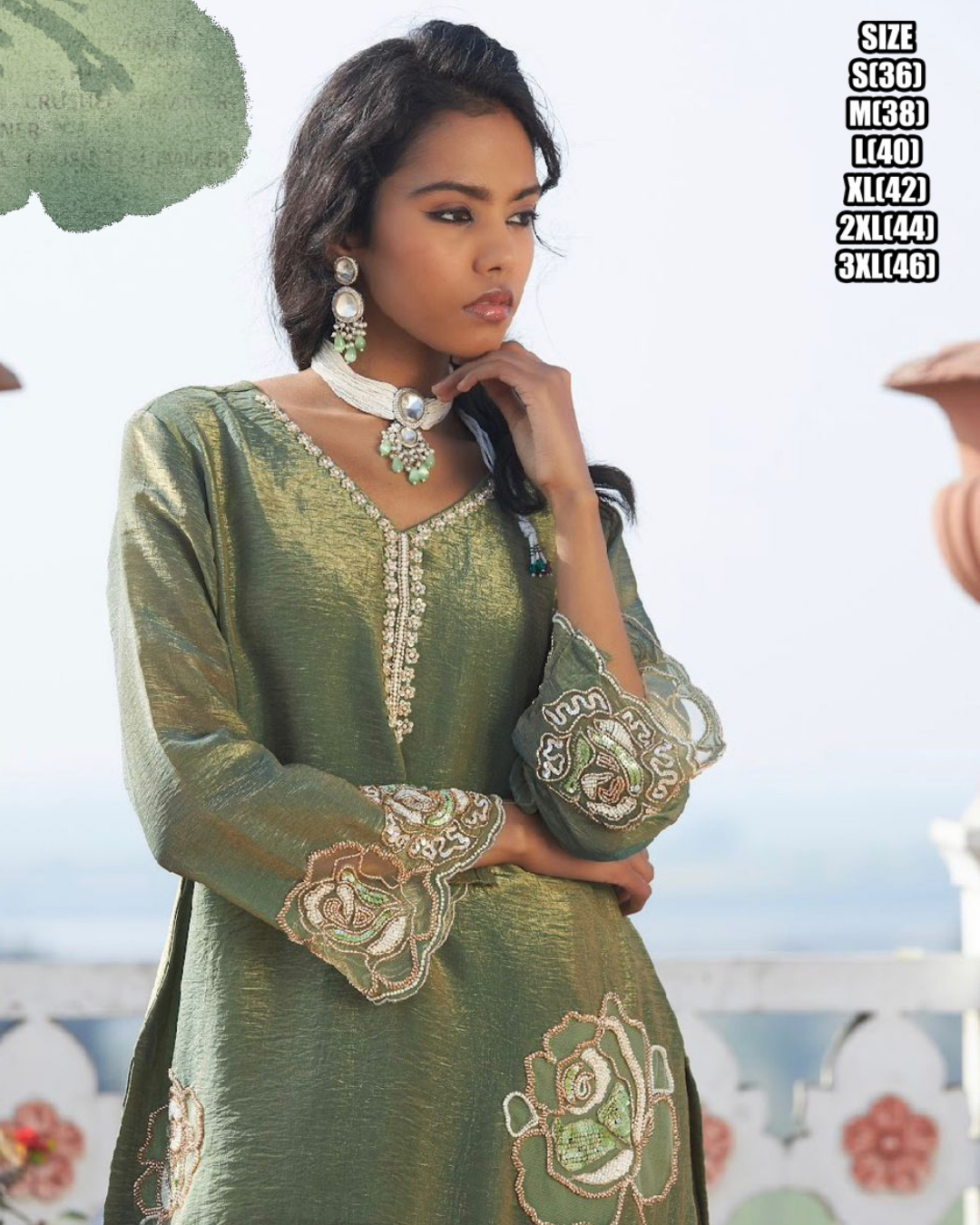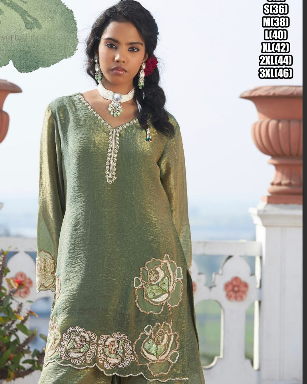 This elegant 3 pc suit is crafted in crushed shimmer fabric, featuring a hand-worked top and bottom with inner lining, paired with a matching crushed shimmer dupatta. Designed for parties and festive occasions, this ensemble delivers radiant shine, comfort, and premium ethnic style.