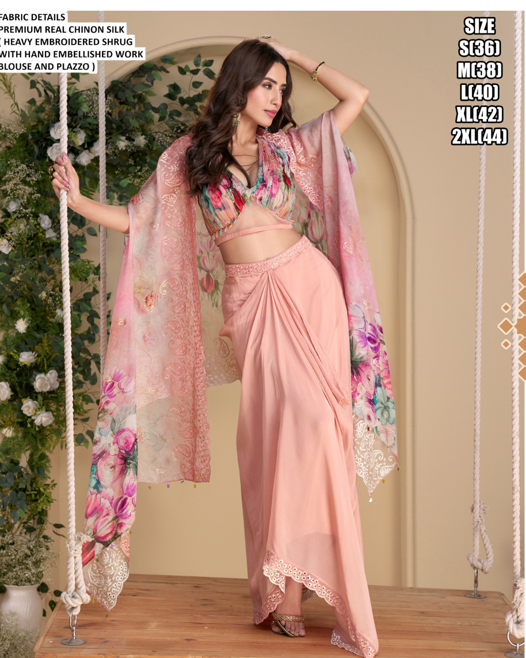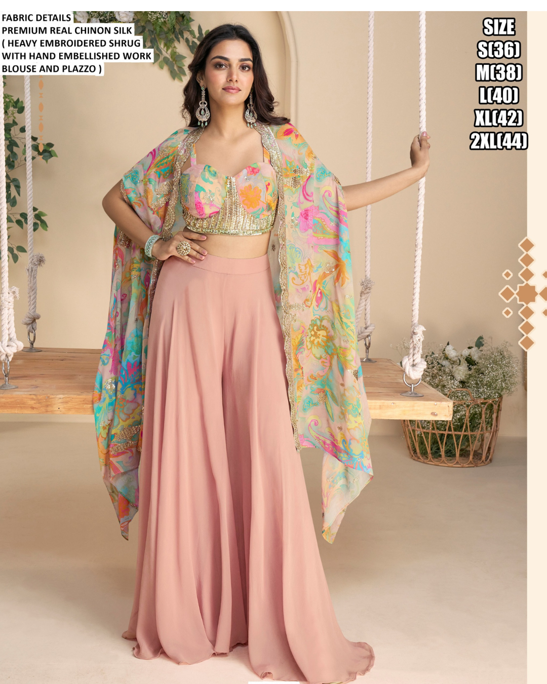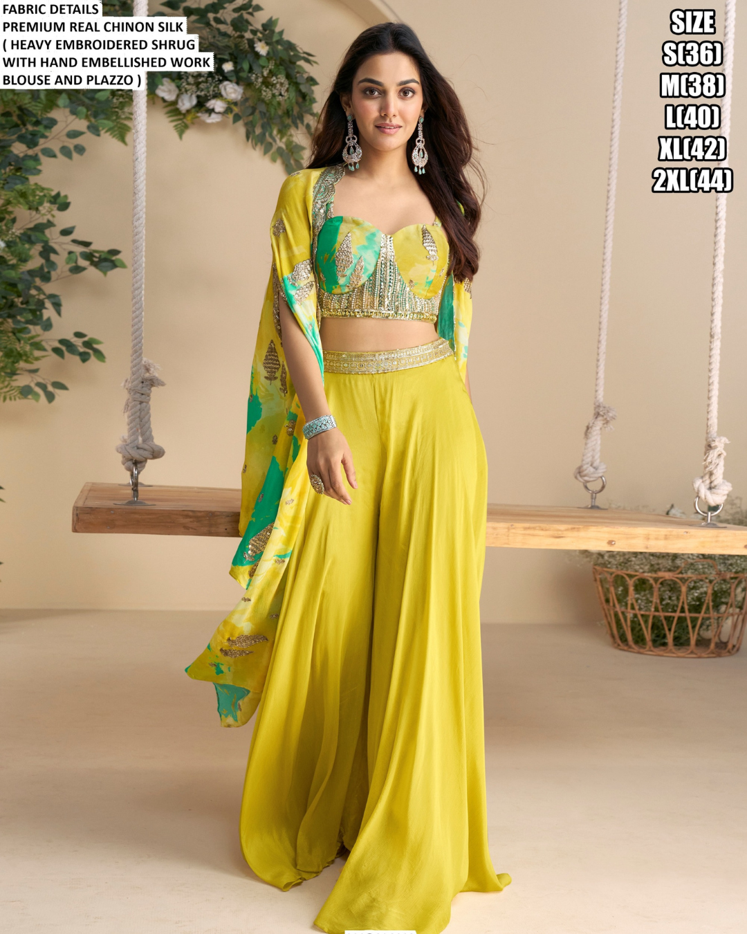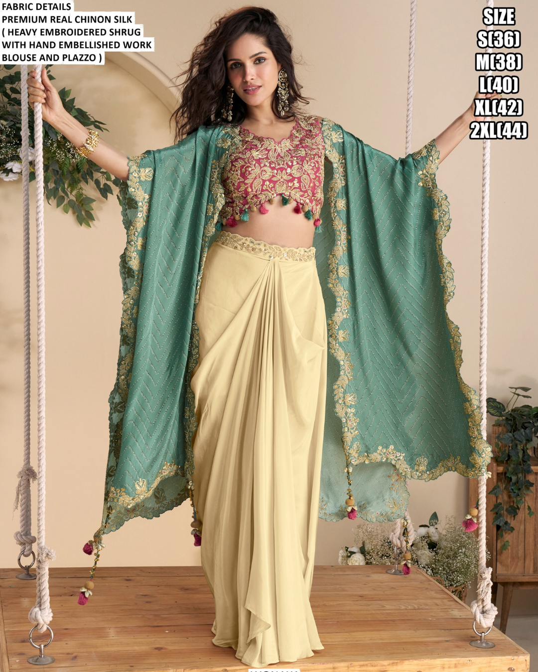 Premium Chinon silk ensemble in the category of ‘3 pc suit’ featuring a heavily embroidered shrug with intricate hand-embellished work, paired with a beautifully crafted blouse and flowy palazzo. Elegant, luxurious and perfect for festive occasions and celebrations