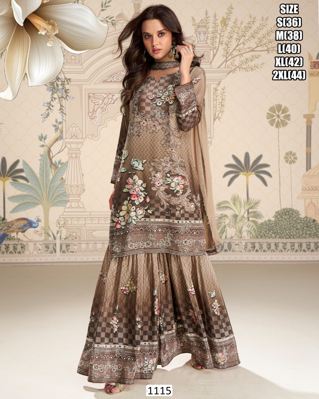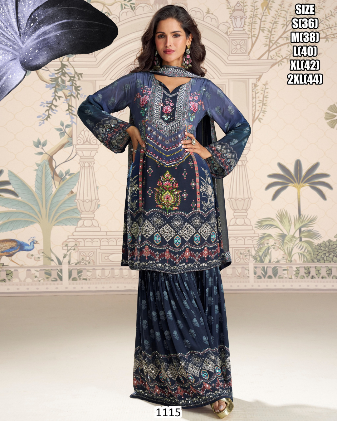 Premium real ‘3 pc suit’ crepe silk gharara set featuring a fully styled mirror-work top, paired with a graceful gharara and a matching dupatta. An elegant choice for festive occasions and special celebrations.