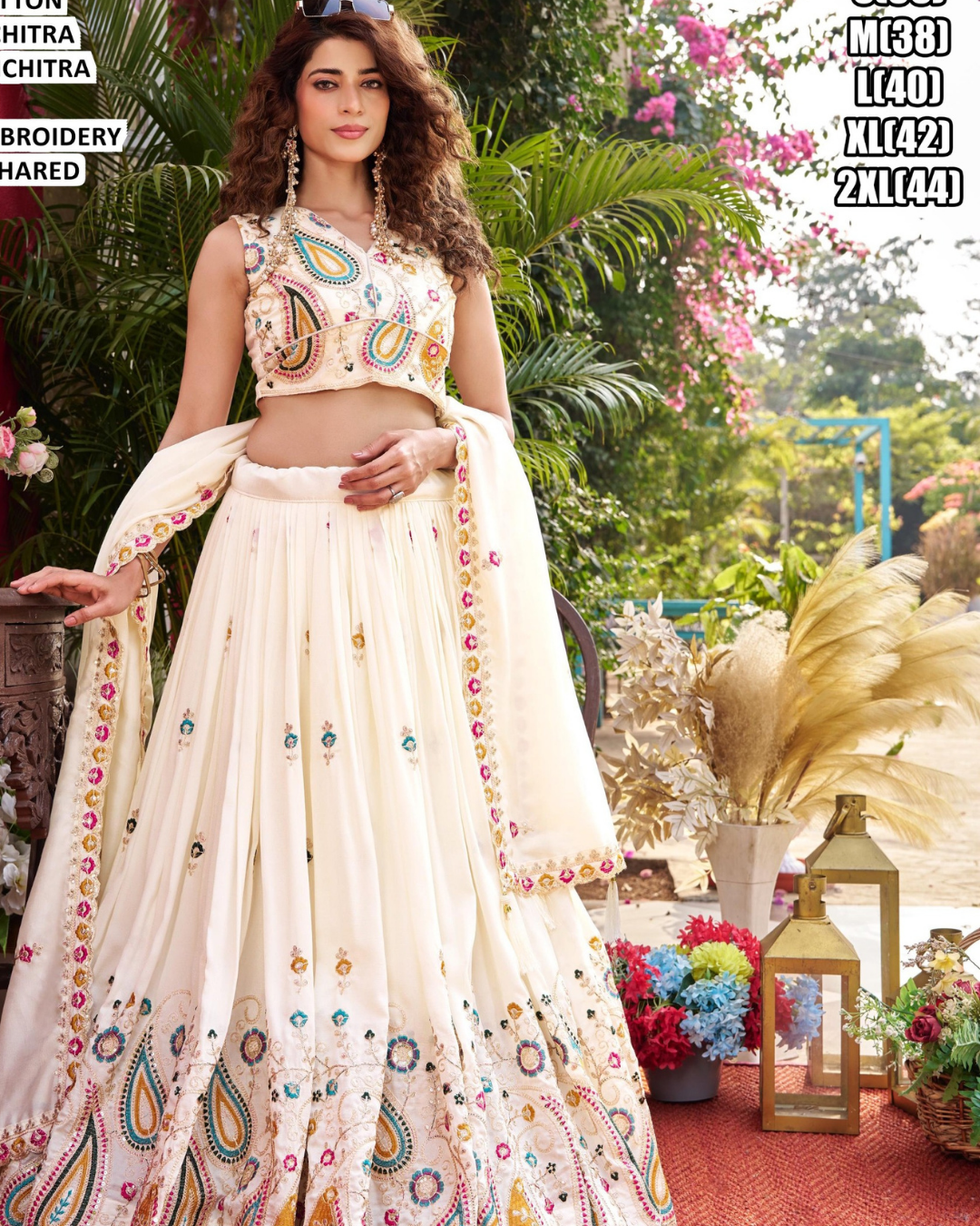 This luxurious 3 pc suit is designed as a premium Pure Vichitra lehenga set, featuring a heavily embroidered lehenga with 3.5-meter flair, paired with a Pure Vichitra blouse and dupatta, and finished with rich sequence and thread work. Ideal for weddings and festive occasions, this ensemble delivers grandeur, elegance, and comfort