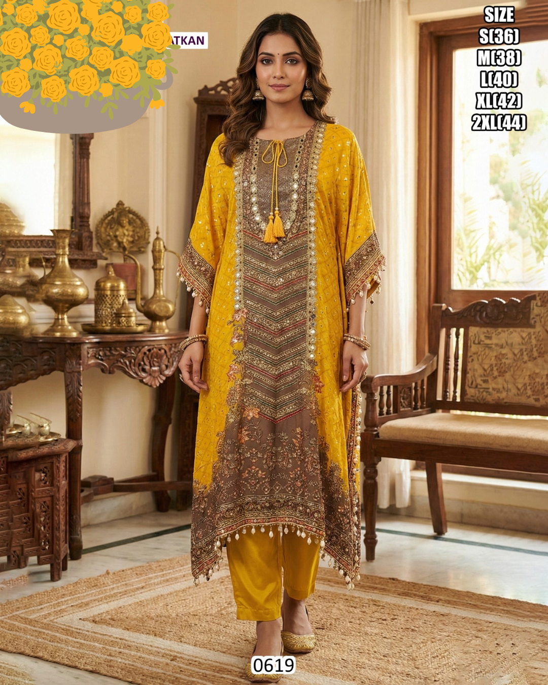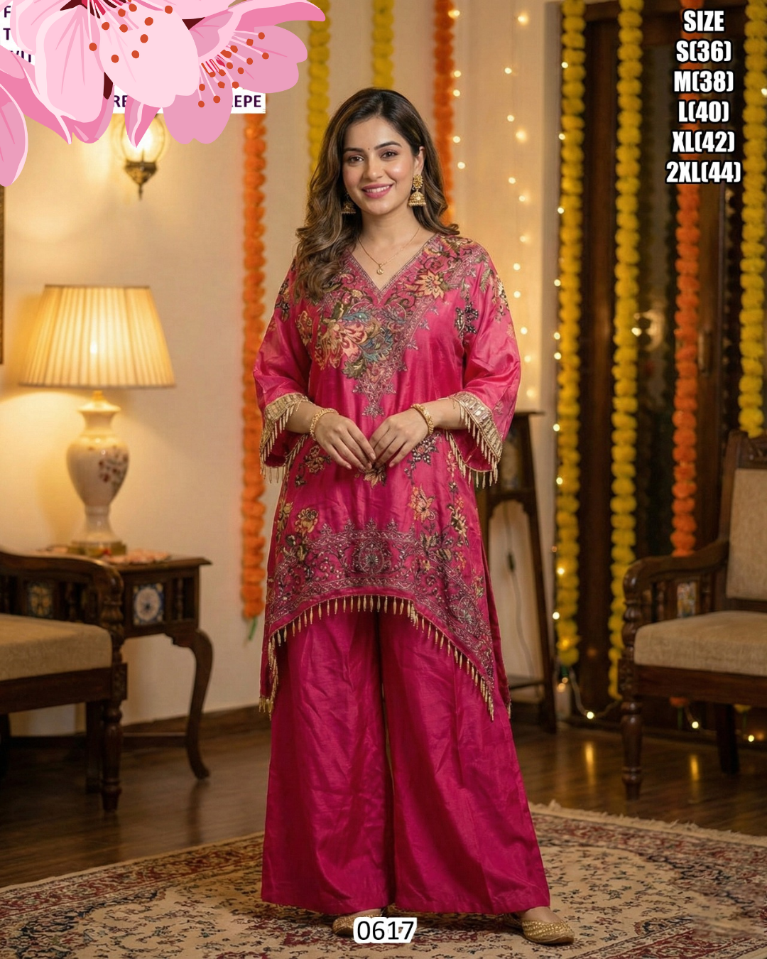 This elegant co ord sets women features a pure natural crepe top adorned with real mirror work and delicate latkan detailing, paired with a rich pure silk bottom to create a refined and luxurious ethnic look. Designed for festive and party occasions, this ensemble blends traditional craftsmanship with premium fabric quality.