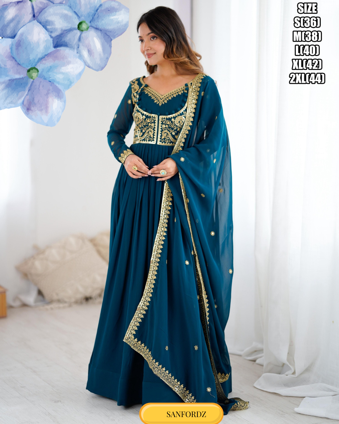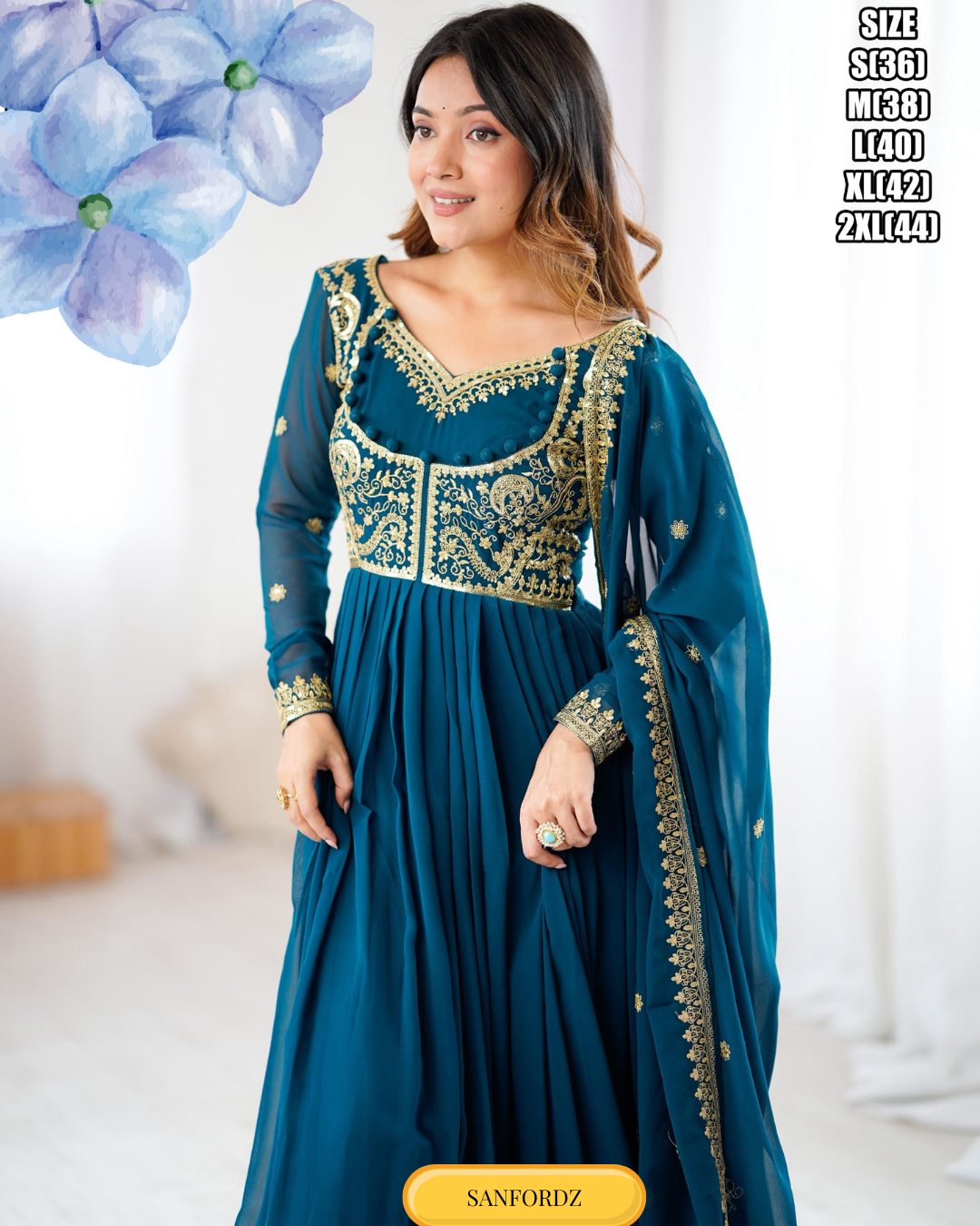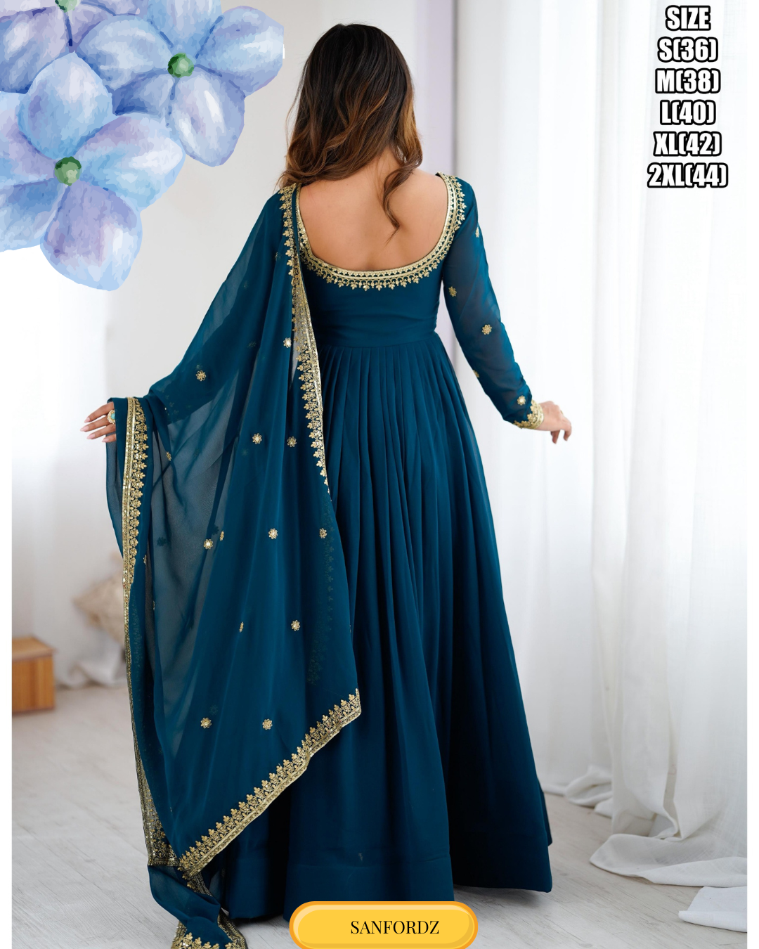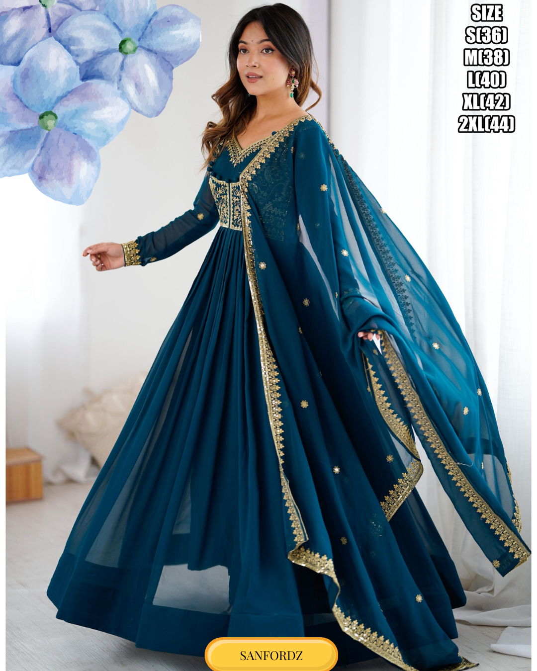 This elegant silk suit set features a faux georgette embroidered top with sequin and thread detailing, paired with a comfortable micro pant and a 2.2m faux georgette dupatta. Lightweight, stylish and festive—ideal for parties, celebrations and family occasions.