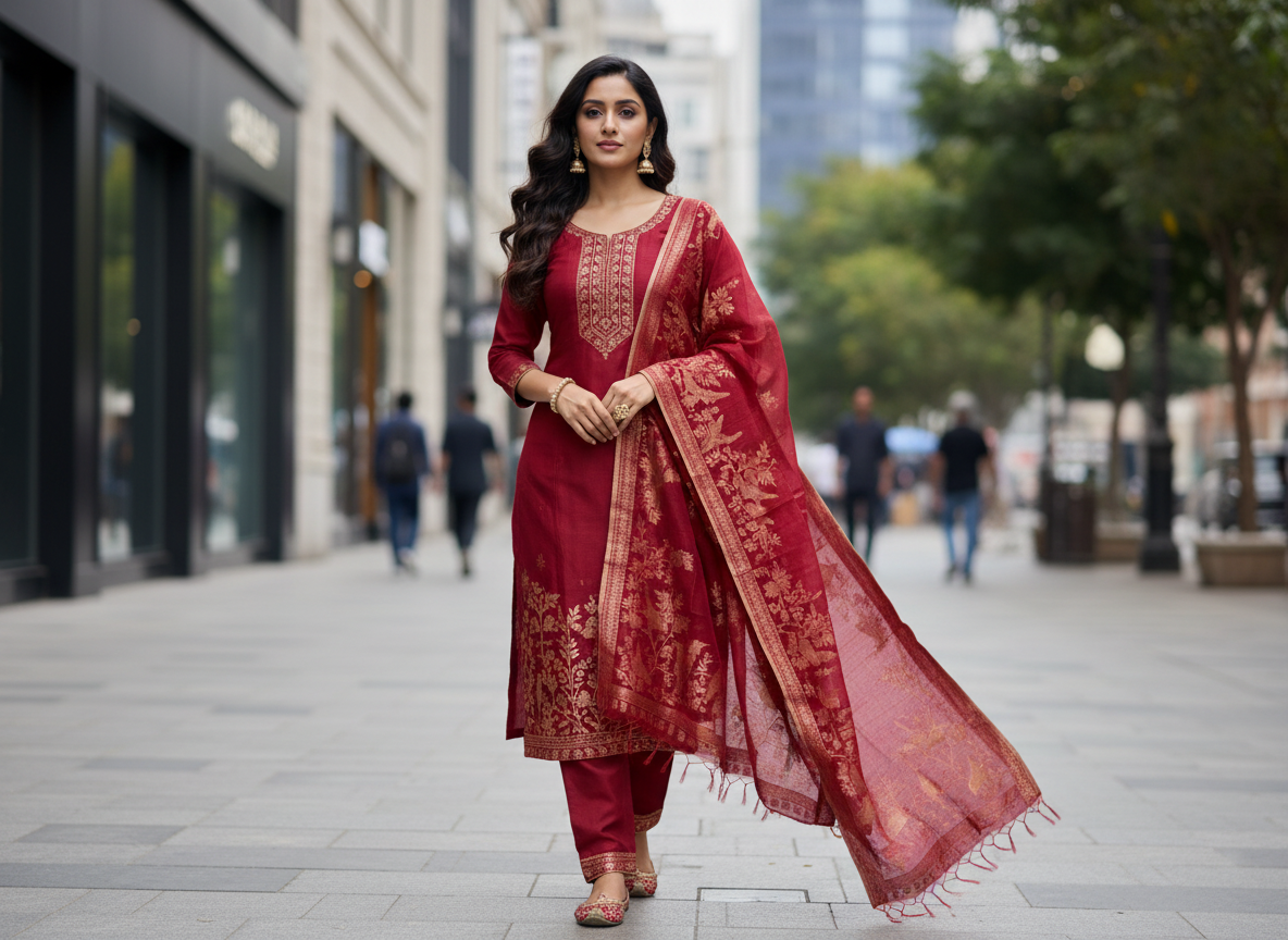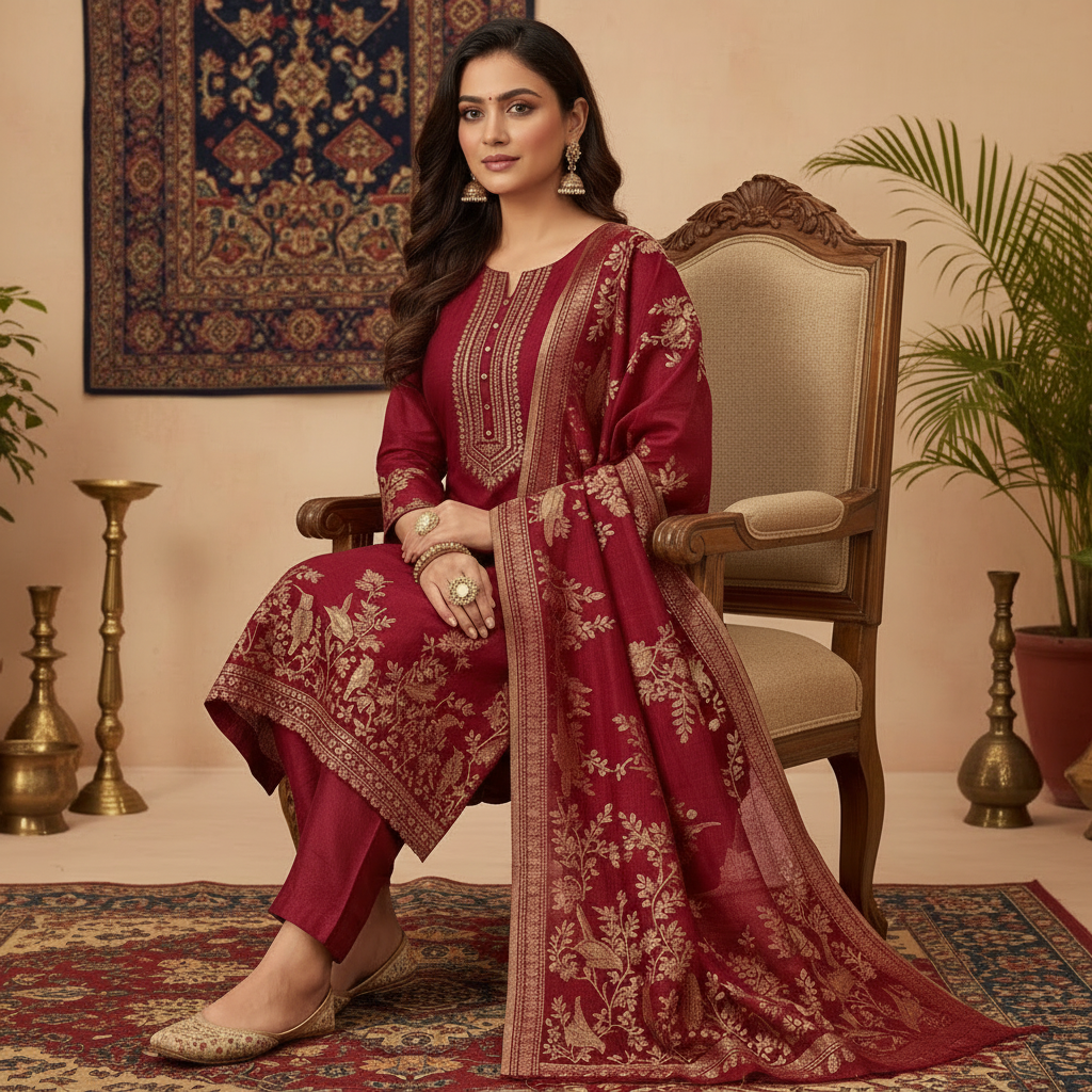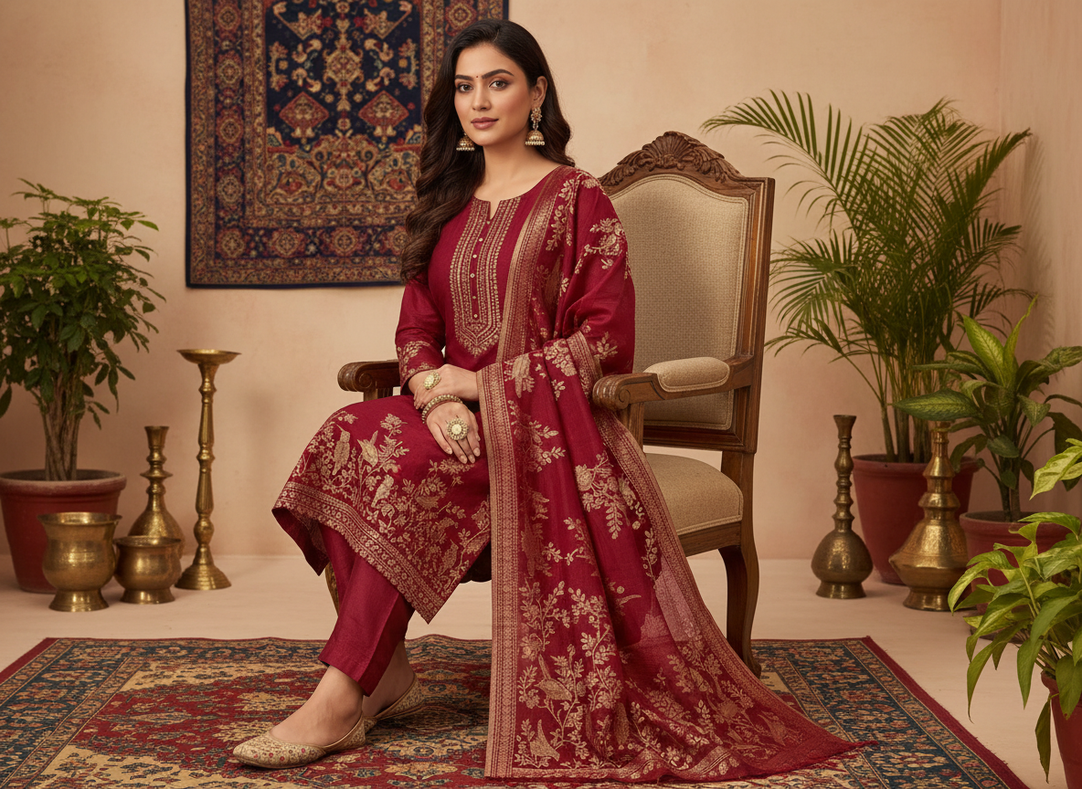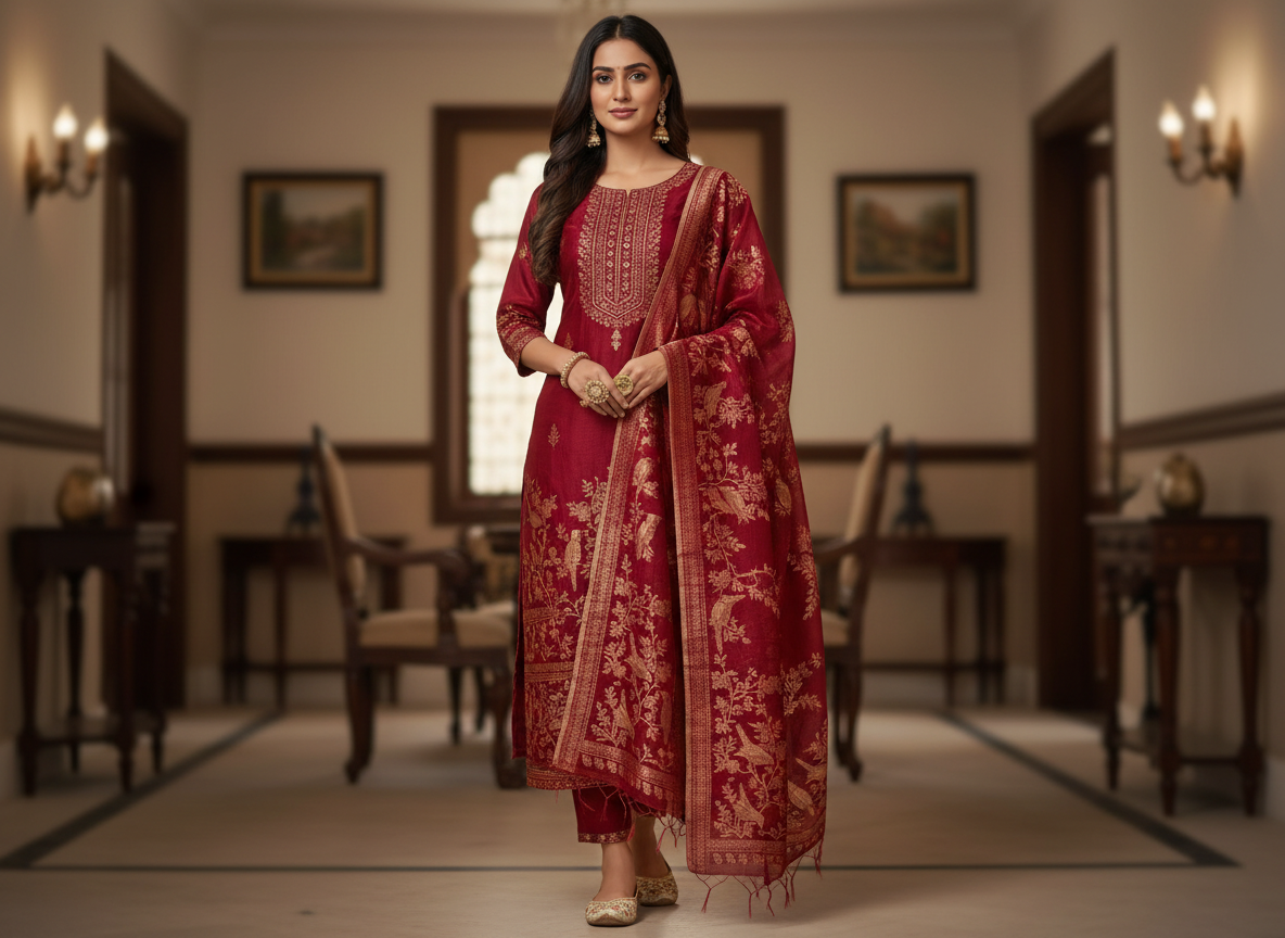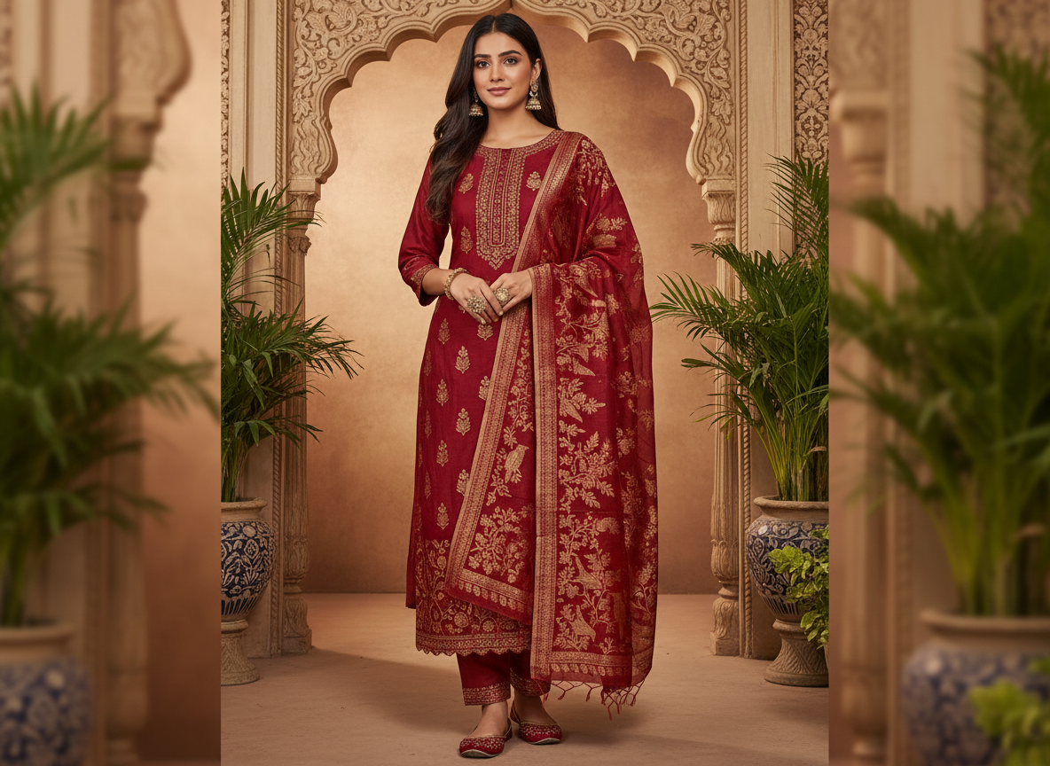 A premium Pure Mulberry Silk Suit Set featuring a woven silk kurta, matching silk bottom and a beautifully crafted Pure Silk Woven Dupatta. Soft, luxurious and elegant — perfect for festive and special occasions.