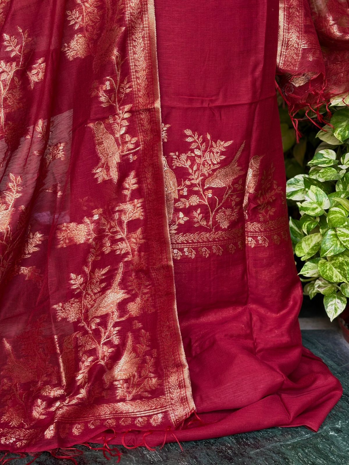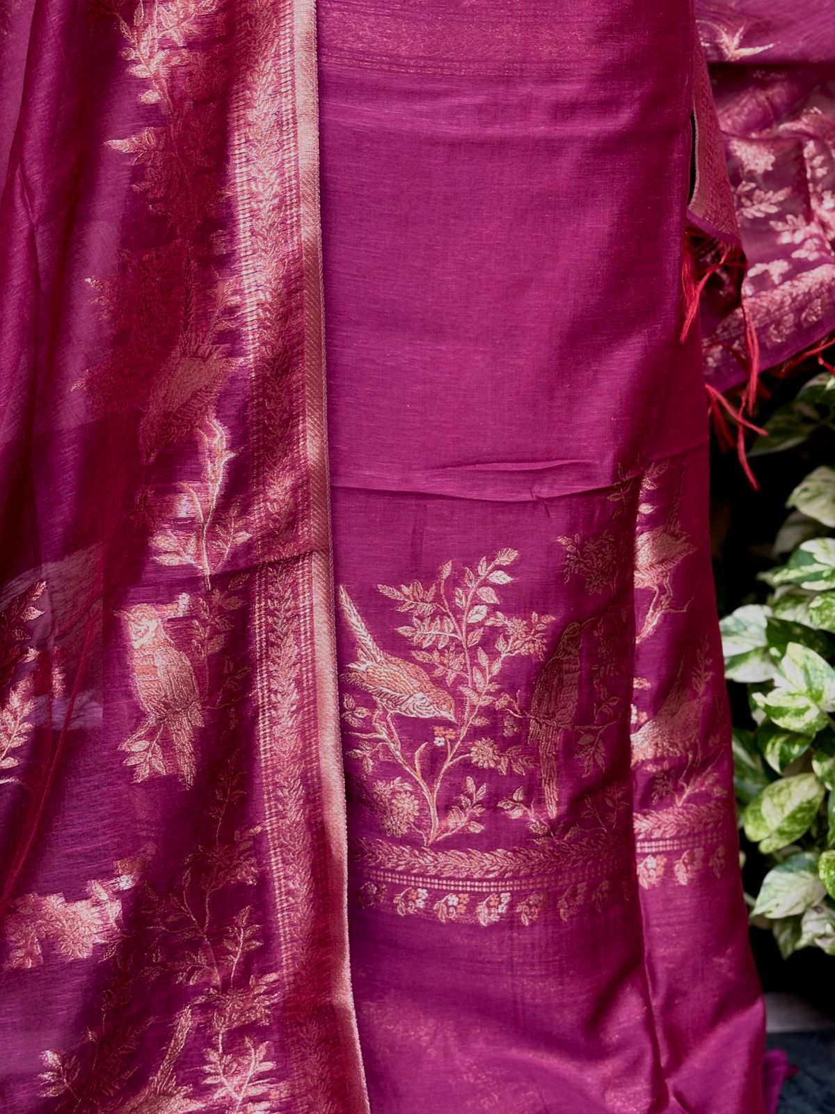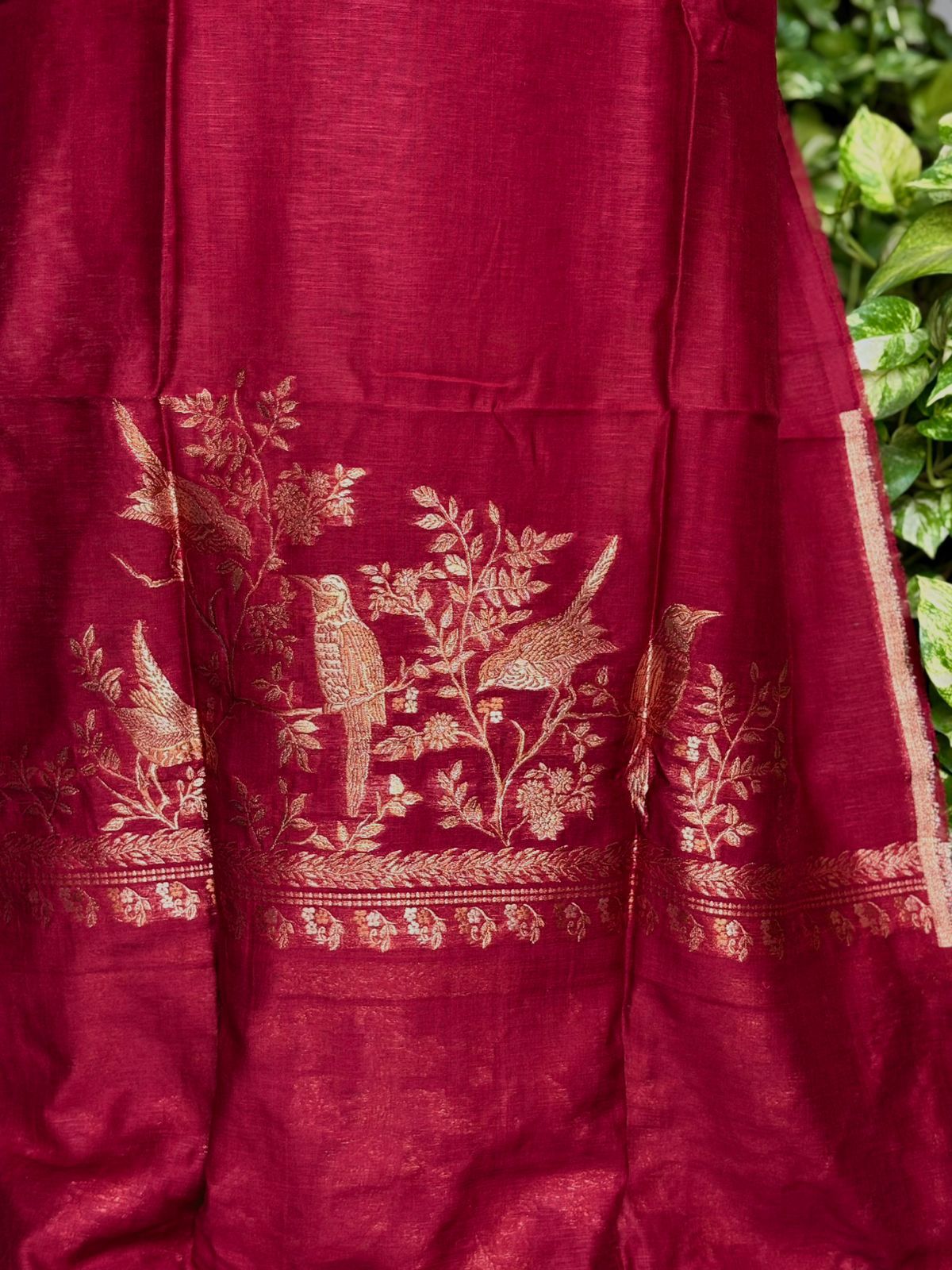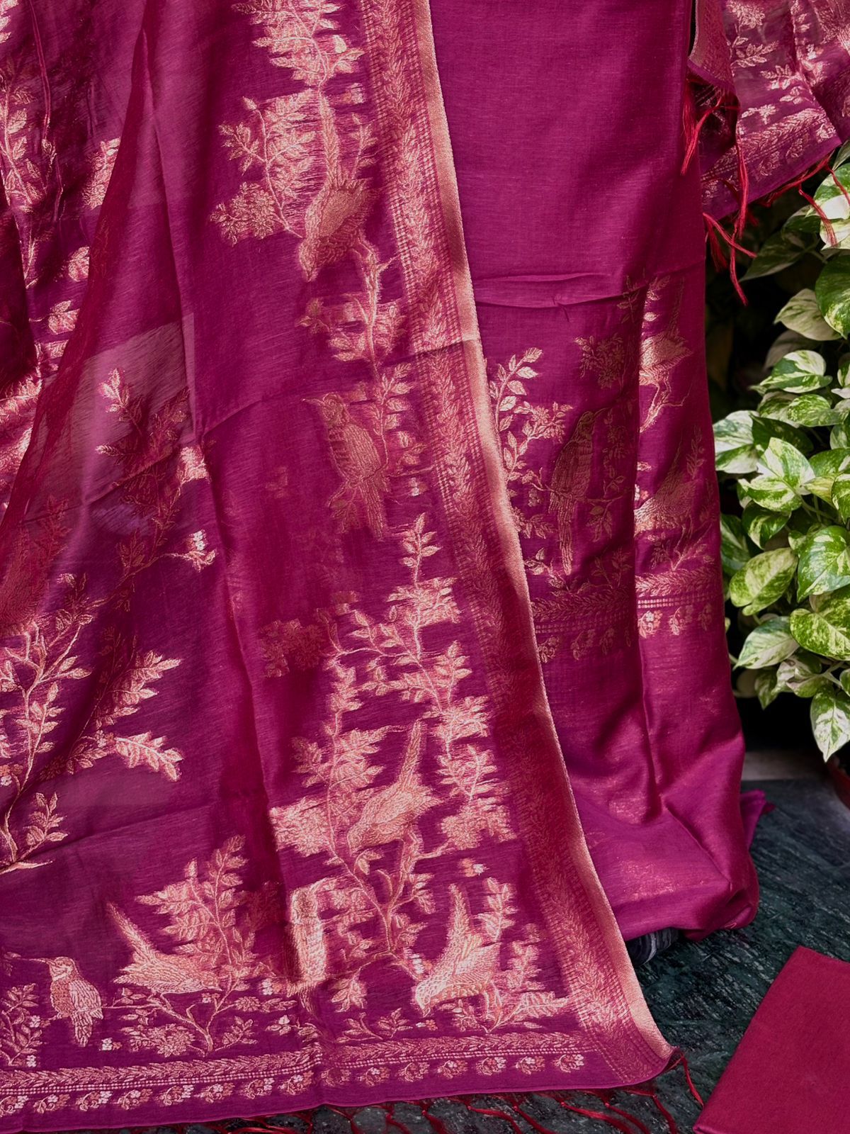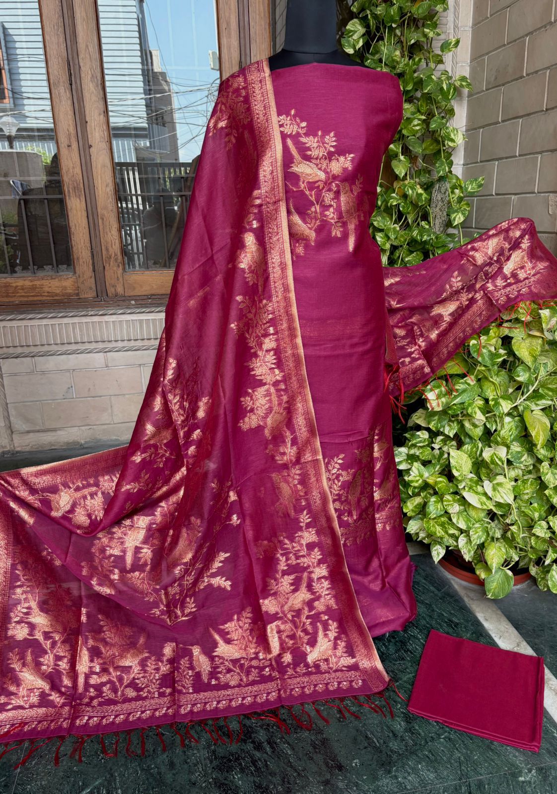 A premium Pure Mulberry Silk Suit Set featuring a woven silk kurta, matching silk bottom and a beautifully crafted Pure Silk Woven Dupatta. Soft, luxurious and elegant — perfect for festive and special occasions.