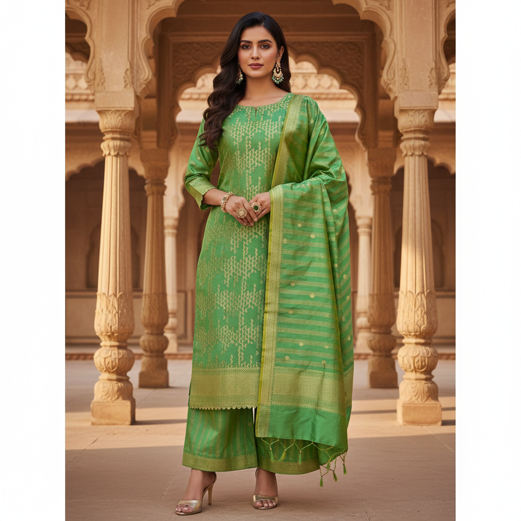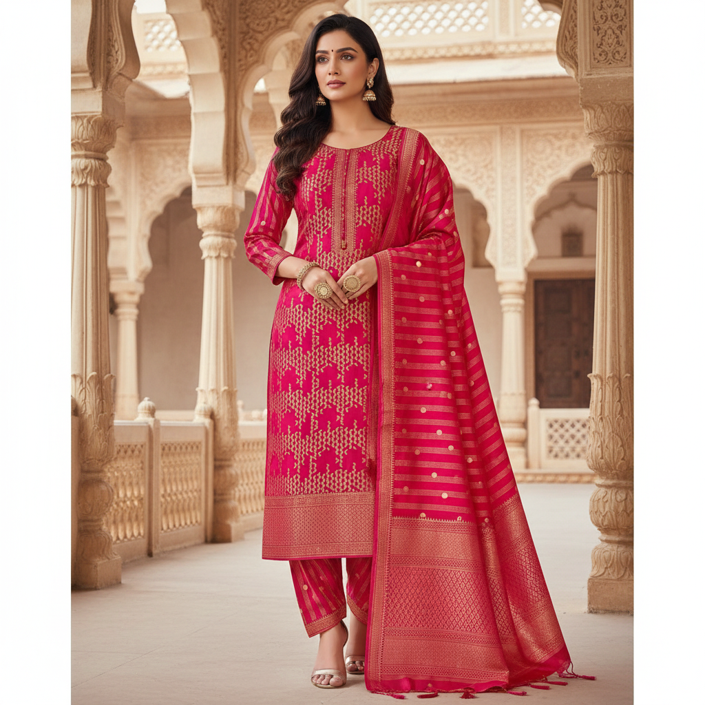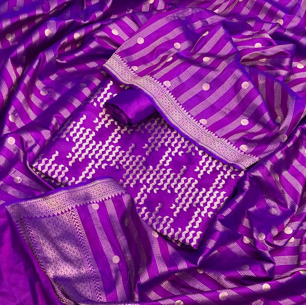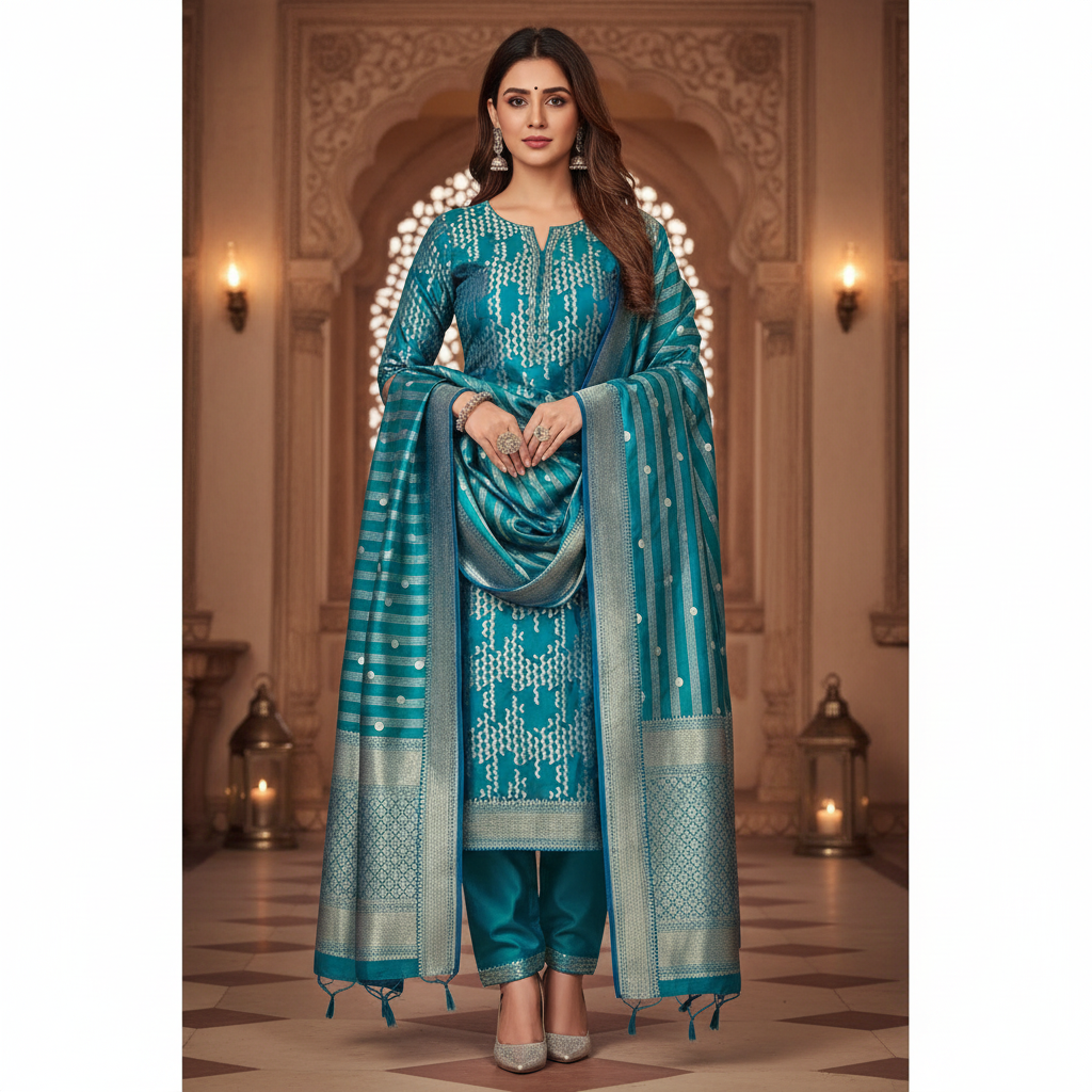 Silk suit in pure silk Banarasi weave, paired with a matching silk bottom and a beautifully woven Pure Silk Banarasi Dupatta. Luxurious, elegant and perfect for festive and special occasions.
