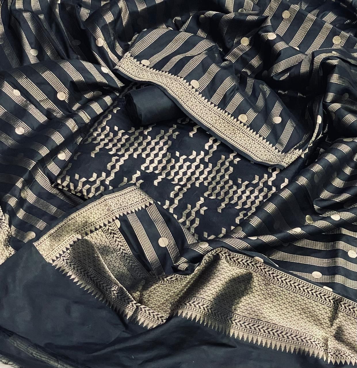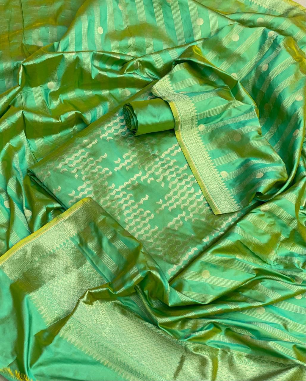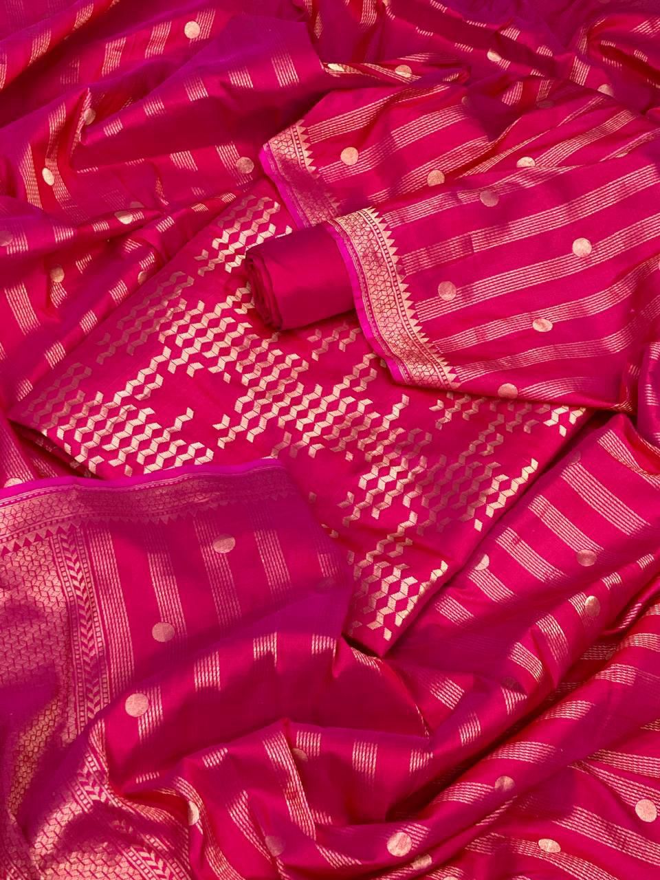 Silk suit in pure silk Banarasi weave, paired with a matching silk bottom and a beautifully woven Pure Silk Banarasi Dupatta. Luxurious, elegant and perfect for festive and special occasions.